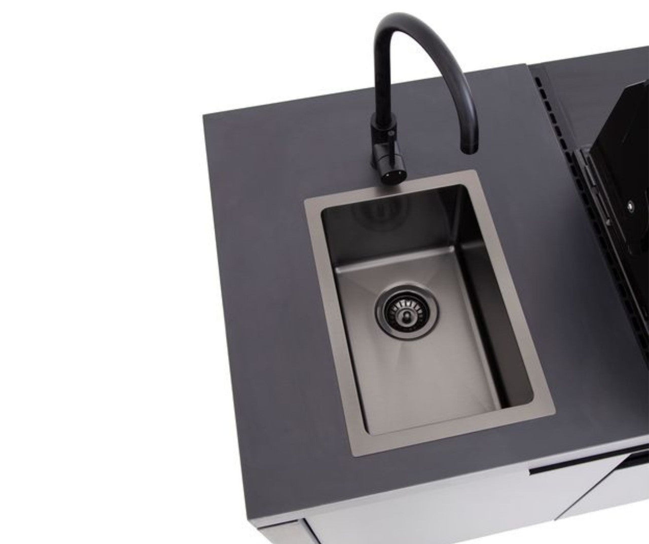 The Beefeater Cabinex Classic Outdoor Kitchen is completed with Black Porcelain bench tops and waterfall ends which are waterproof and resistant to scratching, high temperatures and UV rays being designed and constructed to withstand the variable European climate from heavy rainstorms to hot sunny days.