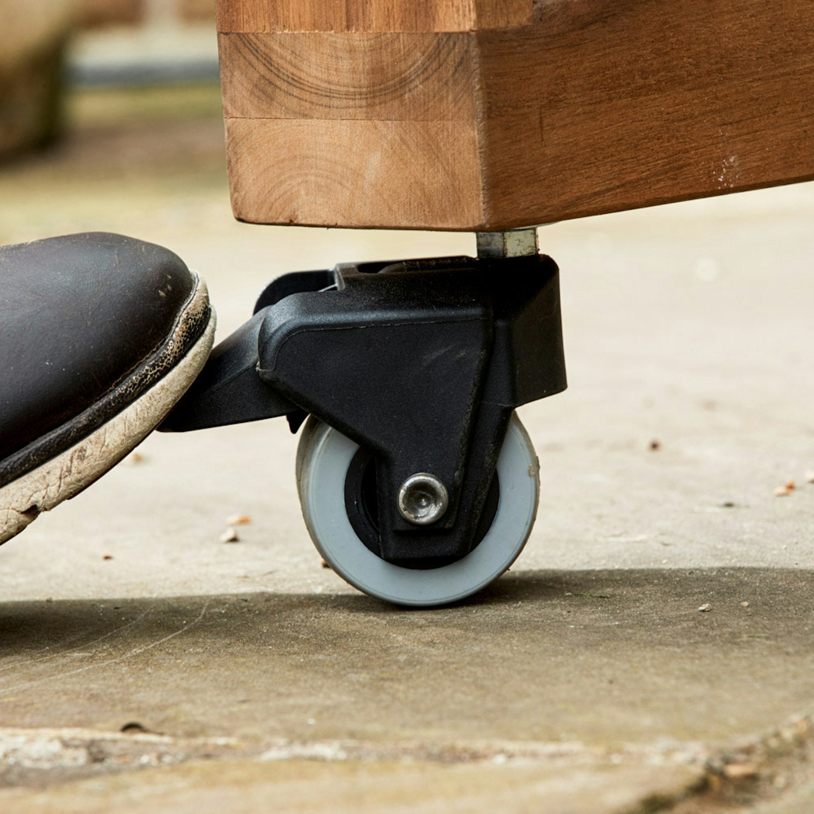 Thanks to a set of locking caster wheels, the Eucalyptus Table can be moved across flat, even surfaces with ease.