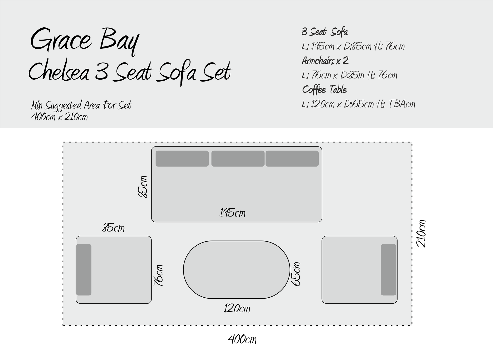 - Armchairs : W: 79cm x D:85cm H: 76cm