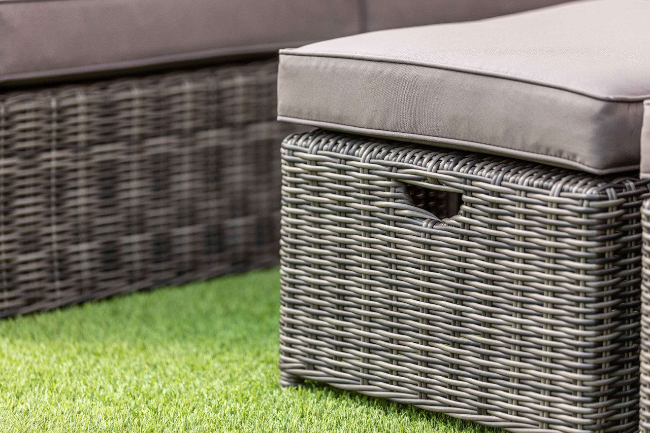 This set includes a coffee table, spacious corner sofa, armchair, and two stools for eight seats. Tight on space? The stools slide conveniently under the coffee table with shaped hand holes for easy movement when additional guests arrive. The coffee table is topped with 5mm tempered glass, and anti-slip pads are included as standard.