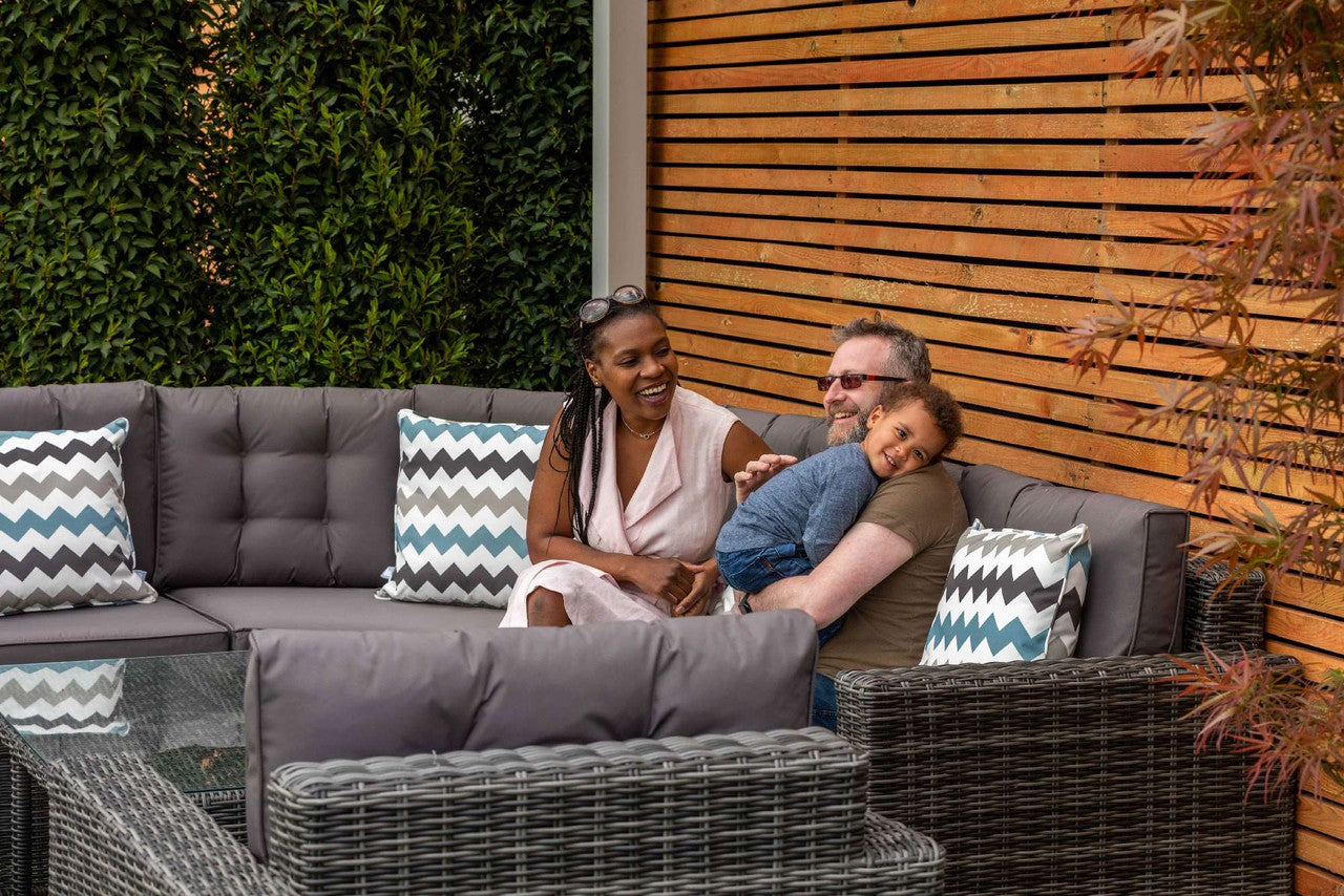 This set has a stunning triple-tone grey hue with matching padded cushions that blend perfectly with any garden style.
