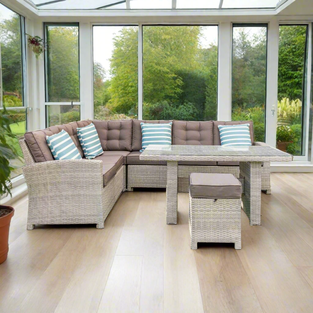 The Grace Bay Casual Dining Corner Set is a must-have for your garden, this incredible set features a spacious corner sofa, a dining table, and a stool for additional seating.