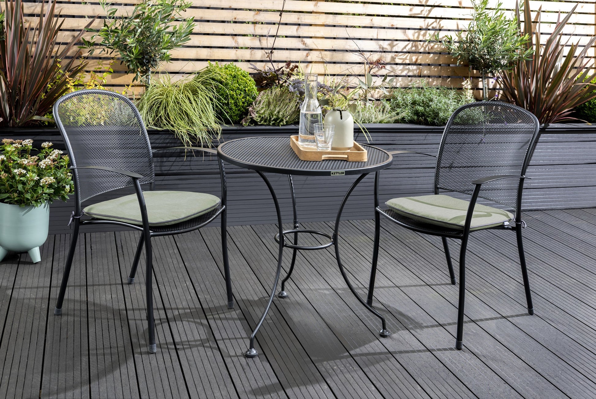 Kettler Caredo Bistro Set with 70cm Round Mesh Table, 2 Chairs with Sage Cushions Pads