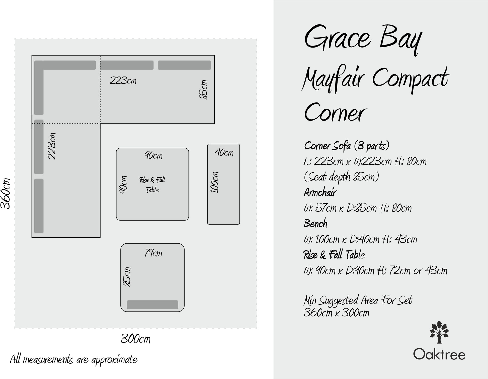 Constructed with a durable aluminium frame, Grace Bay Mayfair furniture sets are perfect for year-round outdoor use. The frame includes a three-year warranty for peace of mind against any manufacturing defects. The Mayfair Compact Corner sofa set boasts deep luxury cushions that are both comfortable and shower-proof, although we advise storing them during periods of non-use. With ample space to seat between 4 and 6 people, this set can accommodate more on special occasions!