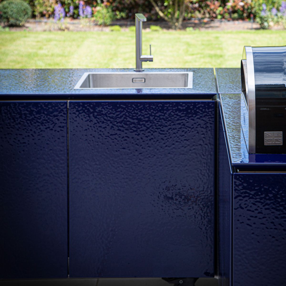 A versatile outdoor kitchen cabinet made from vitreous enamel and stainless steel, which incorporates a stainless-steel sink with mixer tap.